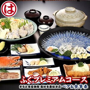 ●ふぐプレミアムコースペアお食事券 ▼▼▼ふぐコースの特徴▼▼▼ ●ふぐプレミアムコース ふぐスタンダードコースに、ふぐのお刺身を増量! さらに、白子焼、ふぐ焼、テッピサラダの付いた、プレミアムコース ■サービス詳細 ●『まるは食堂旅館 南知多豊浜本店』にて、ご利用いただけます。 ●本券1枚で、2名様ご利用いただけます。 ◎ご宿泊券について ●ご宿泊のお部屋は、全室海側(和室10-12畳 、定員4-5名様、バス・トイレ付)。 ●ご宿泊の方は、温泉(うめ乃湯)を無料でご利用いただけます。 ※入浴時間は、チェックイン-0:00、翌朝5:30-7:30。 ●休前日は、お一人1,100円ずつ、まるは食堂の指定日(年末年始、GW、お盆等)は、お一人2,200円ずつ、追加料金を頂戴致します。