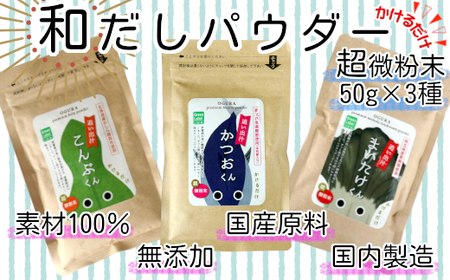 こんぶくん(乾燥昆布粉) 50g×1 かつおくん(鰹節粉) 50g×1 まいたけくん(黒舞茸粉) 50g×1 ■消費期限:製造日から365日