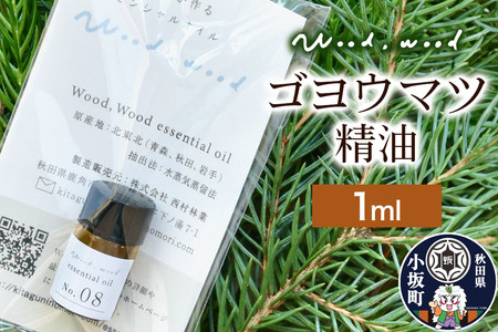 ■名称:精油 ■内容量:1ml ■原材料:ゴヨウマツ ■使用期限:開封後1年以内が目安 ■容器:遮光ガラス瓶 ■保存方法:キャップをしっかり閉め直射日光を避け、風通しの良い冷暗所で保管してください。 ■注意事項: 目に入れたり飲用したリしないでください。 原液は刺激が強いため肌に直接つけるのは控えてください。 ※ふるさと納税(寄附申込み)のキャンセル、返礼品の変更・返品はお受けできません。あらかじめご了承ください。 ■備考:クロネコゆうパケット便での発送となります。 ■提供元:株式会社西村林業 ■地場産品に該当する理由:主原料のゴヨウマツは100%小坂町で採取されたものであり、主原料の付加価値は約99%を占める(告示第5条第2号に該当)