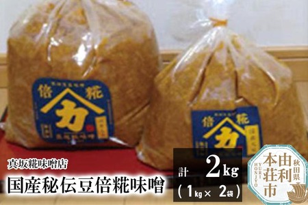 ■名称:国産大豆味噌 ■内容量:国産秘伝豆倍糀味噌 計2kg(1kg×2袋) ■原料:米(国産)、大豆(国産)、食塩 ■原産地:秋田県産・山形県産 ■加工地・製造地:由利本荘市矢島町 ■栄養成分表示:100gあたり エネルギー 174kcal たんぱく質 9.6g 脂質 3.4g 炭水化物 26.2g 食塩相当量 0.91g ■賞味期限:製造より180日間 ■提供元:真坂糀味噌店 ■アレルギー:大豆 ■注意事項: ※ふるさと納税(寄附申込み)のキャンセル、返礼品の変更・返品はお受けできません。あらかじめご了承ください。 ■配送不可地域:離島 ■地場産品に該当する理由:市内にて製造工程のすべてを実施することにより、相応の付加価値が生じている(告示第5条第3号に該当)