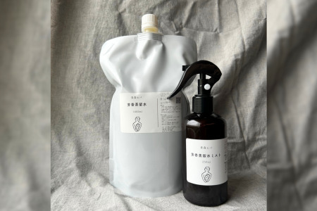 芳香蒸留水ミスト250ml×1 芳香蒸留水(詰替・お風呂用)1000ml×1 学名:Thujopsis dolabrata/ヒノキ科 抽出部位:青森ヒバ木部 抽出方法:水蒸気蒸留法 原産国:日本(青森)