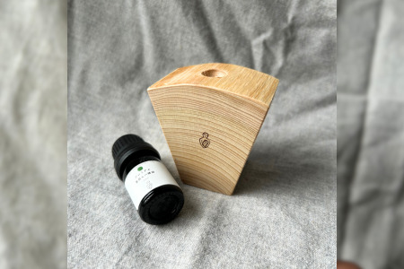 香り木ヒバ(置き型の気化式ディフューザー) 高さ約6~8センチ 厚さ約3.5㎝ プレミアムヒバ精油 5ml 学名:Thujopsis dolabrata/ヒノキ科 抽出部位:青森ヒバ木部 抽出方法:水蒸気蒸留法 原産国:日本(青森)
