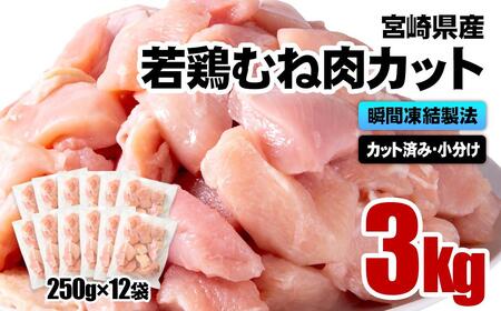 【4月発送】宮崎県産若鶏 鶏肉 むね肉カット 小分け バラバラ凍結 3㎏(250g×12)IQF加工<1.2-75>