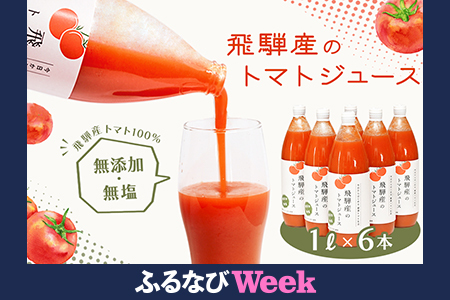 【内容量】飛騨産トマトジュース(1L×6本入り) ※予告なくパッケージが変更となる場合がございます。あらかじめご了承ください。 【原材料】トマト(岐阜県下呂市産 麗月) 【消費期限】製造日より2年間 【保存方法】常温 【提供】株式会社 トマトの丘 【地場産品類型番号】 2 当該地方団体の区域内において返礼品等の原材料の主要な部分が生産されたものであること。 【地場産品に該当する理由】 下呂市内のトマト