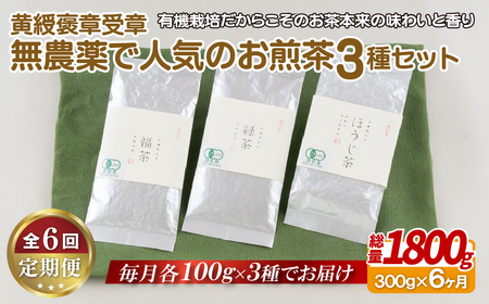 《定期便》 黄綬褒章受章 無農薬で人気のお煎茶3種セット【6回お届け】