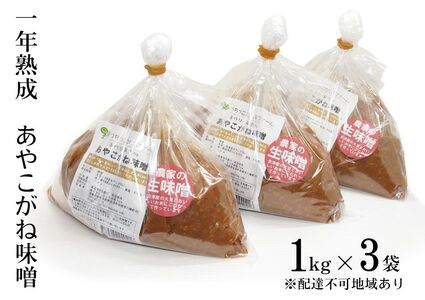 一年熟成あやこがね味噌 1kg入り×3袋 学校給食 無添加 生みそ 大豆 しっとり こだわり 甘み 優しい味 からだにやさしい