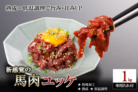 【阿蘇牧場】馬肉 ユッケ 細切り 1000g 1kg 熟成 低温調理 希少 旨み 甘み 焼いたらもっと美味しい 旨みたっぷり 小分け 食べきり 酒のつまみ 酒の肴 おかず 専用タレ付 熊本県小国町