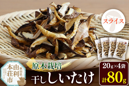 ■名称:乾しいたけ(スライス) ■内容量:20g×4袋 ■原材料:しいたけ(原木)(秋田県産) ■賞味期限:製造から6ヶ月 ■保存方法:高温多湿を避けて常温で保存してください。 ■原産地:秋田県由利本荘市 ■加工地・製造地:秋田県由利本荘市 ■提供元:伊藤美恵子 ■注意事項: ※ふるさと納税(寄附申込み)のキャンセル、返礼品の変更・返品はお受けできません。あらかじめご了承ください。 ■地場産品に該当する理由:主要原材料(しいたけ)が市内産のため(告示第5条第2号に該当)(告示第5条第2号に該当)
