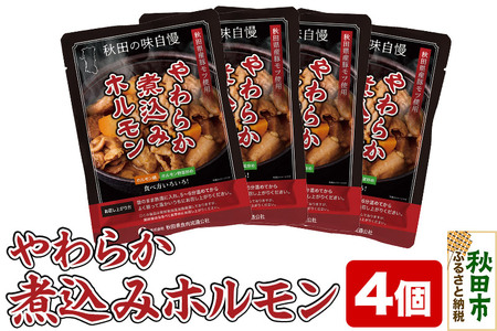 ■名称:やわらか煮込みホルモン ■内容量:200g×4個(800g) ■原材料:豚内臓肉(秋田県産)、醤油(大豆・小麦を含む)、発酵調味料、野菜(玉ねぎ、生姜、小麦を含む)、砂糖、味噌(大豆を含む)、香辛料/調味料(アミノ酸)、パプリカ色素 ■賞味期限:300日以上 ■製造地:秋田県秋田市 ■提供元:株式会社秋田県食肉流通公社 ■アレルギー:小麦、豚肉、大豆、ごま ■注意事項: ※ふるさと納税(寄附申込み)のキャンセル、返礼品の変更・返品はお受けできません。あらかじめご了承ください。 ■配送不可地域:沖縄県,離島 ■地場産品に該当する理由:秋田市内で製造にかかる全工程を実施しているため(告示第5条第3号に該当)