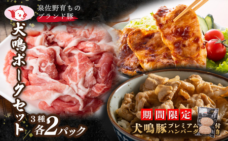 【期間限定】犬鳴ポーク 3種 食べ比べセット(切り落とし/うで/ロース)+手作りプレミアムハンバーグ(2個入り)