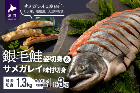 銀毛鮭姿切身1.3kg サメガレイ切身(しお味、塩麹漬、大豆味噌漬)各1切 <賞味期限> ご家庭の冷凍庫で保管の場合は出荷日より約90日(マイナス18℃以下で保存) <原材料> 【銀毛新巻鮭】秋鮭(北海道日高産)・食塩 【大豆味噌漬】サメガレイ・米味噌・砂糖・米発酵調味料・果糖ブドウ糖液糖・昆布エキス・酵母エキス(一部に大豆を含む) 【塩麴漬】サメガレイ・米麹・食塩/酒精 【しお味】サメガレイ・食塩(一部に大豆、さけを含む)