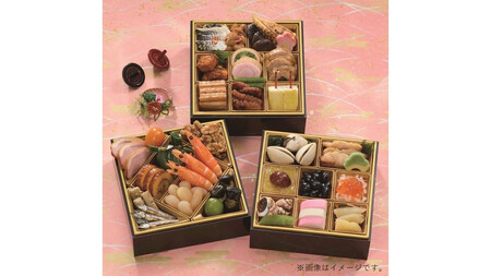 *三段重 *一段外寸:21.9×21.9×5.7cm *3~4人用 ■一の重 日の出龍飛巻、葉付金柑、叩き牛蒡、筍土佐煮、ぶどう豆、南天いくら、初梅甘煮、数の子、粉吹き田作り、紅白柿なます、紅白鶴かぶら、金箔、南天 ■二の重 紅白小袖蒲鉾、菊かぶら、祝海老、鮭年輪巻、あわび旨煮、牛肉時雨煮、のし烏賊、袱紗玉子、鰤西京焼、伊達巻、合鴨ロース、胡桃甘煮、鶏味噌松風、紅白鶴かぶら、手毬餅、南天 ■三の重 棒鱈旨煮、鰆柚庵焼、飛竜頭、椎茸旨煮、湯葉よもぎ麩含め煮、子持鮎甘露煮、あすぱら牛肉巻、酢取蓮根、穴子昆布巻、梅花こんにゃく、栗きんとん、栗渋皮煮、海老黄身寿司、紅白鶴かぶら、南天 ◆仕入れなどの状況により、予告なく内容を変更する場合がございます。あらかじめご了承ください。 【消費期限】 2026年1月1日 ◆お料理を詰め合わせた状態でお届けする冷蔵品です。到着後は冷蔵庫に保存してください。