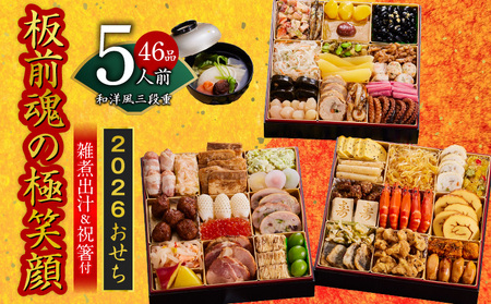 おせち「板前魂の極笑顔」和洋風 三段重 46品 5人前 8.5寸 雑煮出汁 付き