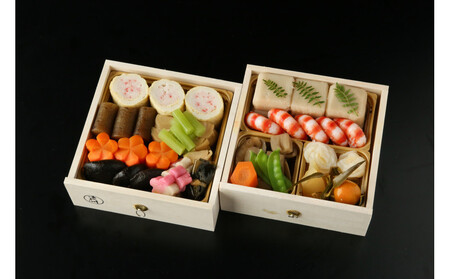2人前 縦:16cm 横:15cm 高さ:6cm×2段 【一の重】 里芋旨煮/車海老/筑前煮/百合根/数の子/葉付金柑/絹さや/木の芽 【二の重】 カニ信田巻/穂付筍煮/梅人参/牛蒡旨煮/椎茸/にしん昆布巻/梅麩/蕗 【賞味期限】 1月1日 23時 【保存方法】 10℃以下で保存して下さい。 【アレルギー】 えび、かに、小麦、卵、大豆、やまいも ※ 表示内容に関しては各事業者の指定に基づき掲載しており、一切の内容を保証するものではございません。 ※ご不明の点がございましたら事業者まで直接お問い合わせ下さい。