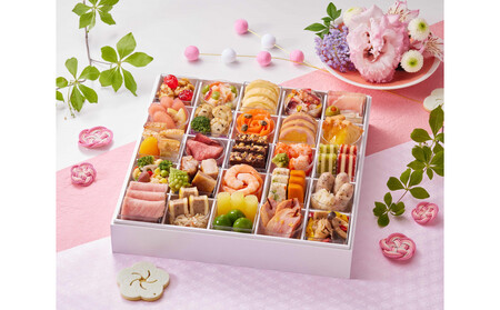 仕様:与段重 6.8寸、品目:43品目、人数:4人前 重箱サイズ: 20.5cm×20.5cm×4.5cm、材質:PS樹脂 ※写真はイメージです。仕入れ等により変更になる場合もございますので、予めご了承ください。