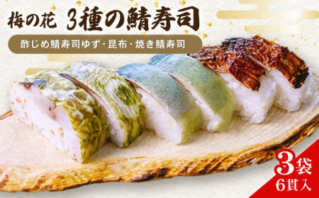 3袋入(1食約270g) ・酢じめ鯖寿司ゆず 2切 ・昆布 2切 ・焼き鯖寿司 2切 【おすすめの「梅の花」の返礼品はこちら!】