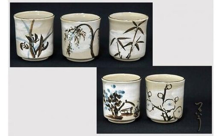 湯呑み茶碗 5客 柄:梅・蘭・柳・竹・山水 サイズ:高さ 約7.8cm、直径 約7cm 重さ:98g前後 *手作り品のため、サイズ・色合い等に若干の個体差が生じますが、それぞれの風合い、趣としてお楽しみください。