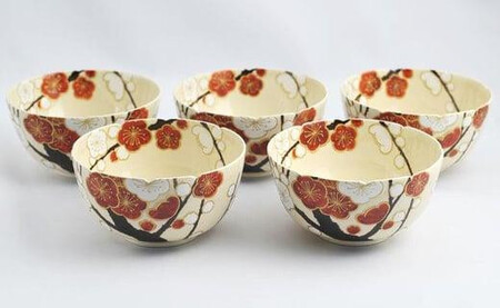 金彩 紅白梅紋輪花向付 5個【水間焼伏原窯】
