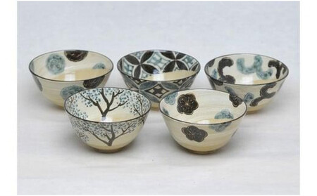 飯茶碗 5客 柄:葵紋・七宝紋・雲紋・木紋・梅紋(各1客) サイズ:直径 約11cm×高さ 約6cm 重さ(目安):約90g前後 手作り品のため、サイズ・色合い等に若干の個体差が生じますが、それぞれの風合い、趣としてお楽しみください。