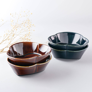■花型小鉢(大)×4(2色×各2点) 箱入り カラー:アメ色・ネイビー サイズ:13×12.5×高4.5cm 重量:180g 原材料・成分:陶器(再生陶土20%使用/Re20) ※サイズや重量には若干の個体差があります。 【対応機器】 電子レンジ○ / オーブン× / 食洗機○ 【加工地】 岐阜県瑞浪市