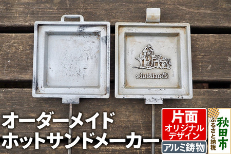■名称:オーダーメイドホットサンドメーカー【片面オリジナルデザイン】 ■内容量:1セット ■サイズ等詳細:<ホットサンドメーカー上側> ・アルミニウム製 ・縦180mm×横145mm×高20mm t=5mm ・ヒンジ部:凸 ・パン耳プレス部の幅10mm ・デザイン印字面 縦100mm×横100mm ・デザイン凸部高さ 2mm <ホットサンドメーカー下側> ・アルミニウム製 ・縦170mm×横145mm×高20mm t=5mm ・ヒンジ部:穴(7mm×30mm) ・パン耳プレス部の幅10mm ・デザイン印字面 縦100mm×横100mm <持ち手> ・1セット2本入り ・止め金具付き ・全長230mm ■お申込み後の流れ:・寄附お申込み後、1週間を目安にオーダーメイドホットサンドメーカー製作の注文手引書(A4両面印刷 1枚)をお届けいたします。 ・注文手引書に従ってデザインデータを送付頂いてから返礼品の製作を始めます。 ・製作期間はデザインを入稿頂いてから約2週間です。 ■注意事項: ・寄附者様に著作権が無いデザインでお作りすることは出来ません。 ・湿気が多い場所に保管すると錆びて破損の原因となります。 ・使用時は火傷にご注意ください ※ふるさと納税(寄附申込み)のキャンセル、返礼品の変更・返品はお受けできません。あらかじめご了承ください。 ■有効期限:お申し込みから1年 ■提供元:有限会社 武藤工芸鋳物 ■配送不可地域:沖縄県,離島 ■地場産品に該当する理由:秋田市内で製造にかかる全工程を実施しているため(告示第5条第3号に該当)