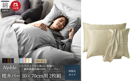 超長綿100% シルクのような艶 枕カバー2枚組 50×70cm枕用 ベージュ 「ノーブル」