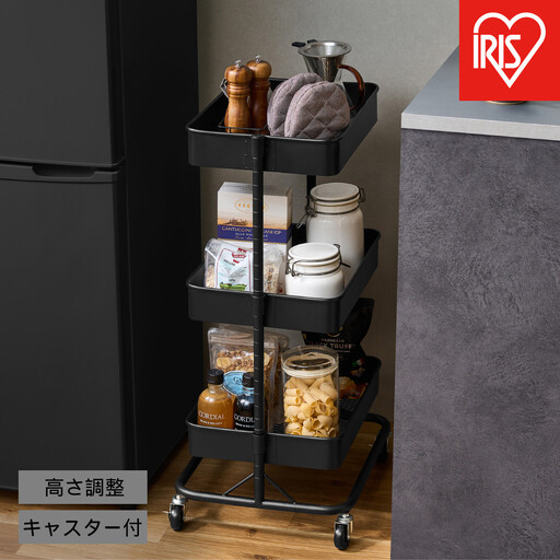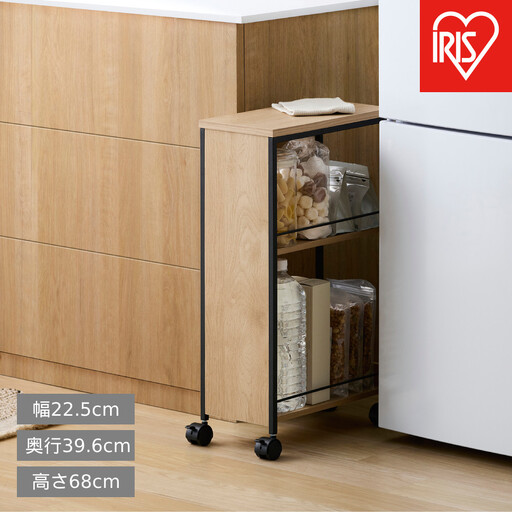●商品サイズ(cm) 幅約22.5×奥行約39.6×高さ約68 ※商品サイズはキャスターを含めたサイズです。 ●質量 約4.2kg ●耐荷重 天板:約10kg 棚板(1枚当たり):約10kg 全体:約30kg ※耐荷重は測定値であり、保証値ではありません。 ●主要材質 天板:合成樹脂化粧パーティクルボード(メラミン樹脂) 棚板・前板:プリント紙化粧パーティクルボード 側フレーム:金属(鋼)(エポキシ樹脂塗装) キャスター:PP、金属(鋼) ●必要工具 +ドライバー(サイズ:2番) ※電動ドライバーの使用可。インパクトドライバーは使用しないでください。