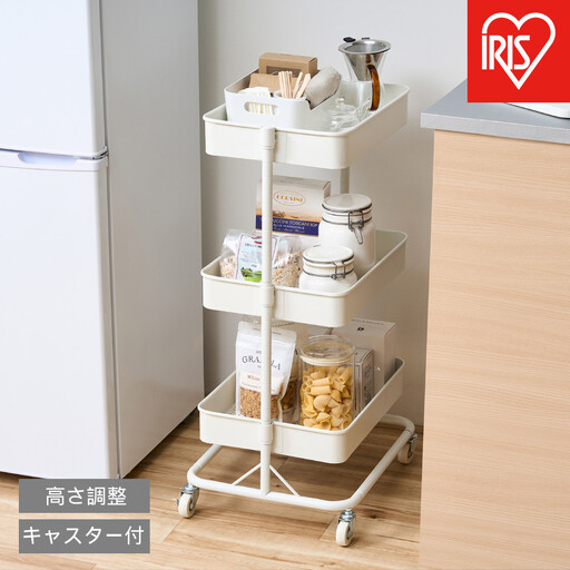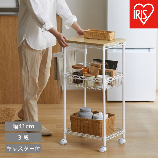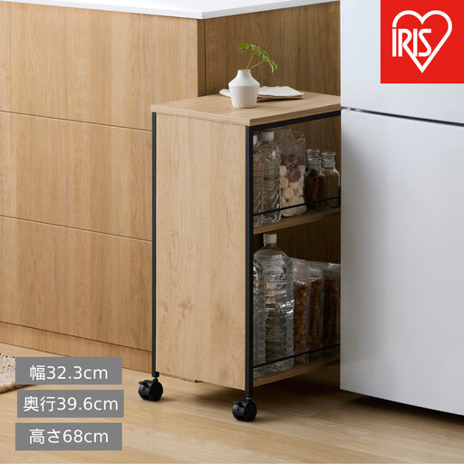 ●商品サイズ(cm) 幅約32.3×奥行約39.6×高さ約68 ※商品サイズはキャスターを含めたサイズです。 ●質量 約5.7kg ●耐荷重 天板:約15kg 棚板(1枚当たり):約15kg 全体:約45kg ※耐荷重は測定値であり、保証値ではありません。 ●主要材質 天板:合成樹脂化粧パーティクルボード(メラミン樹脂) 棚板・前板:プリント紙化粧パーティクルボード 側フレーム:金属(鋼)(エポキシ樹脂塗装) キャスター:PP、金属(鋼) ●必要工具 +ドライバー(サイズ:2番) ※電動ドライバーの使用可。インパクトドライバーは使用しないでください。