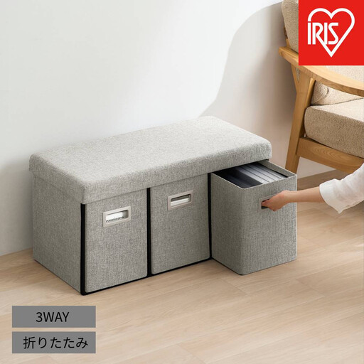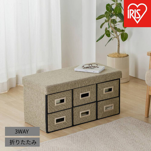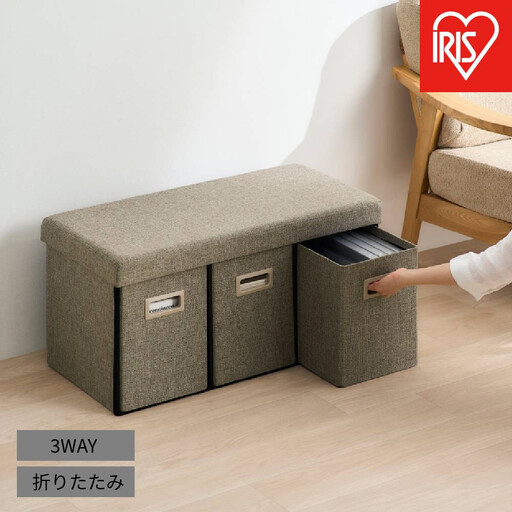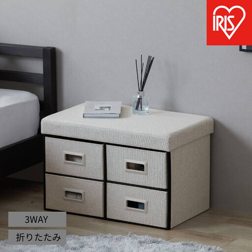 ●製品サイズ(cm) 使用時外寸:幅約76×奥行約37.5×高さ約38.5 座面の高さ:約38.5 本体内寸:幅約72.5×奥行約33.5×高さ約33.5 引き出し(1個あたり)内寸:幅約22.5×奥行約33×高さ約14 折りたたみ時:幅約76×奥行約37.5×高さ約13 ※破損する恐れがあるため、収納ボックスとして使用するときは座らないでください。 ●製品質量 約10.7kg ●構造部材 繊維板 ●張り材 ポリエステル ●クッション材 ウレタンフォーム ●耐荷重 収納ボックス時:天面約10kg/引き出し(1個あたり)約3kg スツール時:約80kg ※耐荷重は測定値であり、保証値ではありません。