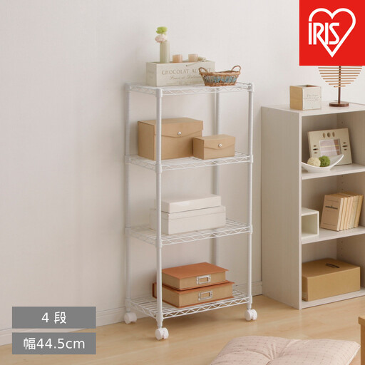●商品サイズ(cm):幅約44.5×奥行約32.5×高さ約102.5(キャスター取付時) ●重量:約4.0kg ●可動棚板:4枚 ●ポール径:約19 ●耐荷重 全体静止時:約60kg 全体走行時:約50kg 棚板(1枚あたり):約15kg ●材質 棚板・ポール:スチール(粉体塗装) 固定部品:ABS樹脂 スリーブ:ポリプロピレン キャスター:ナイロン樹脂