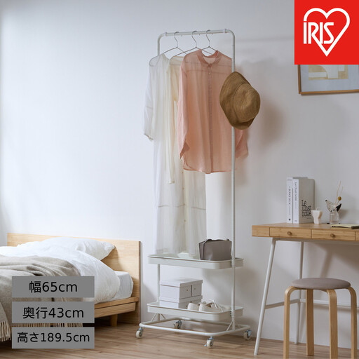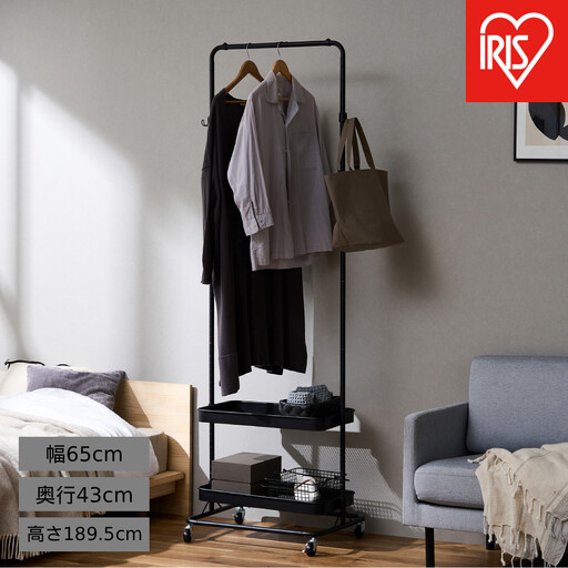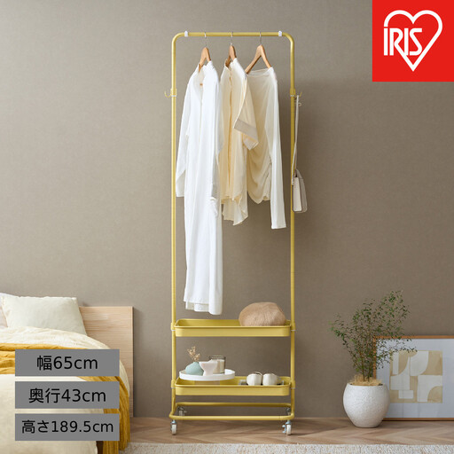 ●製品サイズ(cm) 幅約65×奥行約43×高さ約113.3/138.7/164.1/189.5(キャスター含む) ●製品質量 約4.9kg ●耐荷重 かご1段あたり:約15kg ハンガーバー:約15kg フック:約1kg 全体:約47kg ●主要材質 本体:金属(鋼)(エポキシ樹脂塗装) キャスター:ポリプロピレン