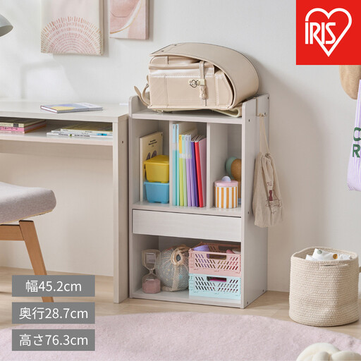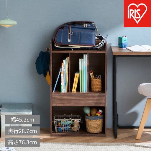 ●商品サイズ(cm):幅45.2×奥行28.7×高さ76.3 ●商品重量(kg):10.46 ●耐荷重(約):全体37kg、天板10kg、固定棚板10kg、底板10kg、引き出し3kg、フック1個あたり2kg●天板サイズ(約):428×270mm●本棚内寸(約):134×272×324mm●引き出し内寸(約):391×235×66mm●オープンスペース内寸(約):428×272×231mm ●素材:プリント紙化粧パーティクルボード、プリント紙化粧繊維板