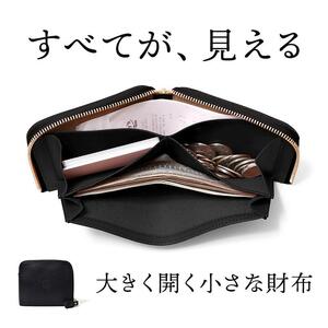 商品名:大きく開く小さな財布 素材:【本体】牛革(オイルレザー)/栃木レザー、【内装】綿 カラー:ブラック(黒糸) サイズ:縦10cm×横12cm(引き手含まず)×厚み2.3cm、【お札・レシート用スペース/奥】縦8cm×横22cm、【お札・レシート用スペース/手前】縦8cm×横17.5cm、マチ最大3cm、【コイン・カード用スペース】縦7cm×横10cm、マチ最大5.5cm ※おおよそのサイズになります。 質量:約110g 仕様:お札・レシート用スペース×2、コイン・カード用スペース×2(カードは約15枚収納) お届けの内容:本体/取扱説明書