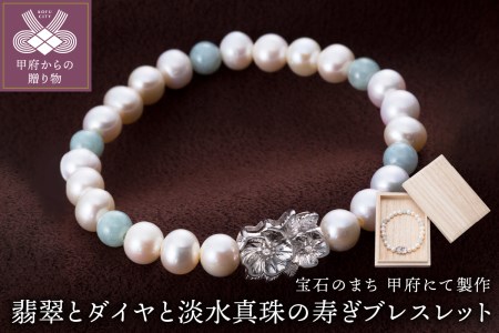 山梨県甲府市にて製作 淡水真珠の寿ぎブレスレット 翡翠とダイヤ使用