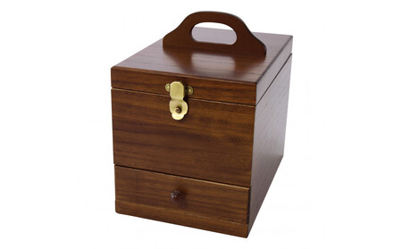 ・本体サイズ:H22(27)×W32.5×D17cm ・内寸:(手づくり品につき個体差があるため目安) (1)上段(左右) 約W14.5×D14.2cm 深さ約5.4cm (2)フタ裏(左右) 約W13.4×D14.2cm 深さ約2.5cm (3)中段(引き出し) 約W13.8×D13.6cm 深さ約3.6cm ×2 (4)下段(引き出し)約W28.9×D13.6cm 深さ約5.0cm ・重量:1,850g