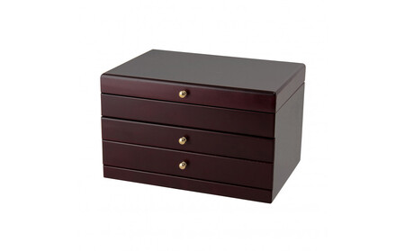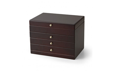 ・本体サイズ:H16.5×W26.5×D20cm ・内寸:(手づくり品につき個体差があるため目安) <上部> (1)奥両脇4マス 約W6.0×D3.4cm (2)リングホルダー 約W11.4cm 3列 (3)手前スペース 約W24.6×D8.5cm (高さ約5.0cm以内のジュエリーを収納可能) <引出し上段> (4)約W5.3×D15.7cm(4列) (高さ約2.4cm以内のジュエリーを収納可能) <引出し下段> (5)約W23.4×D15.7cm (高さ約3.0cm以内のジュエリーを収納可能) ・重量:2,000g