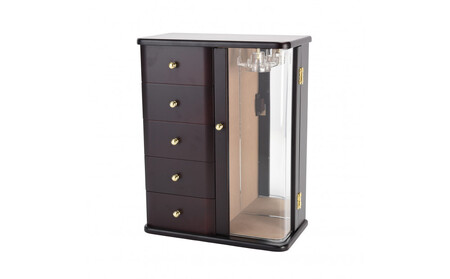 ・本体サイズ:H31×W24×D13cm ・ミラー部サイズ:約H28.8×W9.8cm ・内寸:(手づくり品につき個体差があるため目安) (1)引き出しフリー×4(約W8×D8.8、深さ4.4cm) (2)リングホルダー×1(4列) ・重量:2,270g