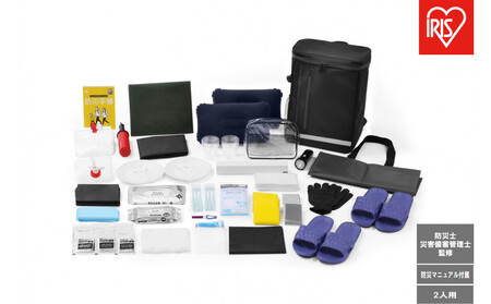 ●商品サイズ(cm) 幅約34×奥行約17.5×高さ約45 ●製品重量 約4.8kg ●収納重量 約10kgまで ※収納重量は測定値であり、保証値ではありません。 ●セット内容 【寝具、防寒】 エア枕×2 エアベッド×2 ポンプ アルミマット アルミブランケット×2 【食事】 紙皿、プラコップ×2 スプーンフォーク×2 ウォータータンク5L ラップ 【移動】 ポンチョ×2 軍手 【衛生用品】 歯ブラシ3本×2 ティッシュペーパー マスク トイレ用ポンチョ 携帯用トイレ凝固剤×30回分 長期保存からだふき×2 長期保存ウェットティッシュ 【照明】 懐中電灯ランタン(乾電池別売り) 【その他】 ホイッスル EVAスリッパ×2 ポーチ タオル ポリ袋 衣類圧縮袋 マルチバッグ 防災手帳 ●保証期間:お届けより1年間