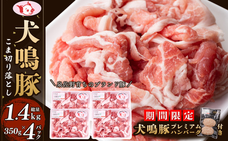 【期間限定】犬鳴豚の小間切り落とし 1.4kg(約350g×4パック)+手作りプレミアムハンバーグ(2個入り)