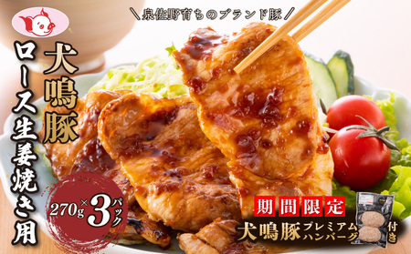 【期間限定】犬鳴豚 生姜焼き用 ローススライス 約270g×3P+手作りプレミアムハンバーグ(2個入り)