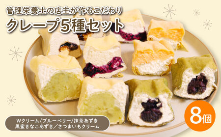 【容量】 クレープ8個 ・Wクリーム×3 ・ブルーベリー×1 ・抹茶あずき×1 ・黒蜜きなこあずき×1 ・さつまいもクリーム×2 【原材料】 国産小麦、豆乳ホイップ、国産小豆、国産豆乳、国産牛乳、卵、甜菜糖、 全粒粉、無塩バター、黒蜜、銚子産ブルーベリー、さつまいも、抹茶、塩、 米油、乳化剤、安定剤、メタリン酸Na香料、pH調整剤、セルロース、 酸化防止剤、塩化マグネシウム 【賞味期限】 製造後 約2週間 ※解凍後はお早めにお召し上がりください。 【アレルギー】 卵・乳成分・小麦・大豆 ※抹茶あずきと黒蜜きなこあずきにははちみつが含まれますので乳幼児には与えないでください。 【保存方法】 冷凍(-18℃以下)で保存