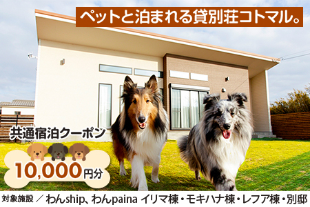 ペットと泊まれる貸別荘コトマル。 共通宿泊クーポン 10,000円分 【下記の貸別荘コトマル。グループでご利用いただけます】 ・わんship…小・中型犬対応。大型犬不可(小さな大型犬も含む) ※最大5名まで ・わんpaina イリマ棟…小・中型犬対応で。大型犬不可(小さな大型犬も含む) ※最大6名まで ・わんpaina モキハナ棟…小・中型犬対応。大型犬不可(小さな大型犬も含む) ※最大6名まで ・わんpaina レフア棟…小型~大型犬対応 ※最大6名まで ・わんpaina別邸…小型~大型犬対応 ※最大6名まで 有効期限 / クーポンコード送信日から1年