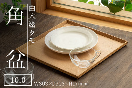 【内容】 白木塗タモ 10.0角盆 1枚 【サイズ】 W303 × D303 × H17(mm) 【素材】 底:タモ合板 フチ:ナラ無垢材 【塗装】 木製ウレタン塗装 【外装】 紙貼り化粧箱入 【注意事項】 食洗機での洗浄はご遠慮ください。 手洗いの際、中性洗剤を使用し、洗浄後は水気をしっかりとふき取ってください。 紫外線のもとにさらさないようにご注意ください。 【キーワード】 工芸品 伝統 国産 トレイ 贈答 ギフト プレゼント 包装 お盆 木製 福井県鯖江市 【地場産品基準】 類型:3 鯖江市内の工房において、木地の製造・加工から中塗・上塗等の工程を行うことにより、相応の付加価値が生じているもの