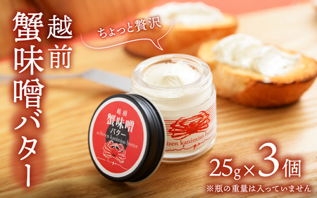 ■容量 越前蟹味噌バター(一瓶25g)×3個 ■原材料 福井県産紅ズワイ蟹蟹味噌、バター、粉末唐辛子、ブランデー、みりん、昆布、食塩、醤油(小麦、大豆を含む) ■本品に含まれるアレルギー表示28品目 乳、かに、小麦、大豆 ■消費期限 製造日より60日以内(要冷蔵) ■注意事項 ※画像はイメージです。 ※冷蔵のお届けとなりますので、届きましたら直ぐに冷蔵庫にて保管してください。 ※開封後はすぐ冷蔵庫(10℃以下)に入れお早めにお召し上がり下さい。 ※室温で戻しクリーム状になってからお召し上がり下さい。