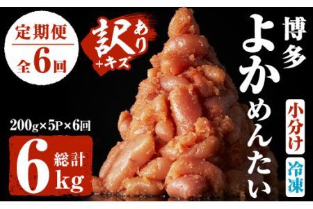 <定期便・全6回(隔月)><訳あり・キズ>福岡直送 辛子明太子(総量6kg・1kg×6回)めんたいこ 切子 切れ子 海鮮 無着色 冷凍 小分け お土産<離島配送不可>【ksg1186】【富八商店】
