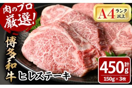 博多和牛ヒレステーキ(150g×3枚・計450g)牛肉 黒毛和牛 国産 ステーキ<離島配送不可>【ksg0447】【MEATPLUS】