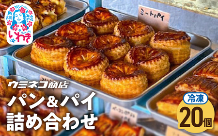 メロンパン・カレーパン・ミートパイ・ベーコンポテトパイ・フレンチアップルパイ・さつまいものパイ・ブルーベリーとクリームチーズのパイ・クランチチョコパイ・板チョコパイ・和栗モンブランパイなどの中から20個。 同じ種類のものが2~3個入る場合もあります。