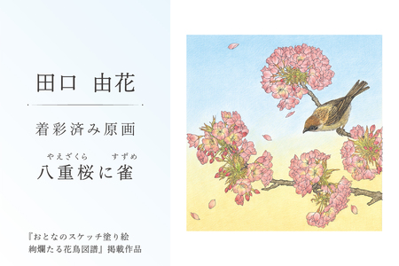 【ふるなび限定】田口由花 着彩済み原画「八重桜に雀(やえざくらにすずめ)」(『おとなのスケッチ塗り絵 絢爛たる花鳥図譜』掲載作品)【0109-002-2】 FN-Limited-SP
