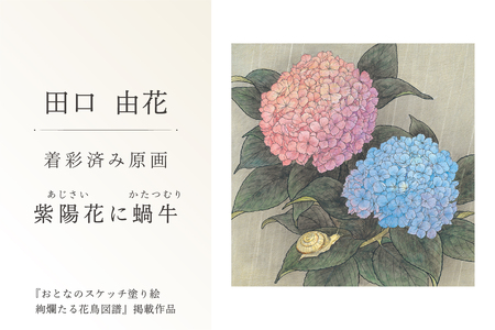 【ふるなび限定】田口由花 着彩済み原画「紫陽花に蝸牛(あじさいにかたつむり)」(『おとなのスケッチ塗り絵 絢爛たる花鳥図譜』掲載作品)【0109-002-5】 FN-Limited-SP