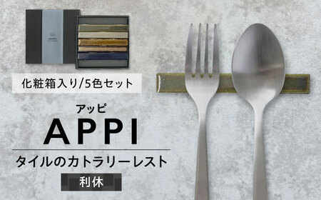 カトラリーレスト5点セット 内訳:カトラリーレスト5個、化粧箱、紙帯 【素材】 カトラリーレスト:磁器 箱:紙 【サイズ】 本体(�o):約98×12.5×6 箱(�o):105×105×20 【重量】 1ピース:約16g 【使用上のご注意】 ※汚れた場合はキッチン用中性洗剤などで洗ってください。 ※強く洗い過ぎるとタイル表面に傷が付いてしまう恐れがありますのでご注意ください。 ※洗浄後は必ず水拭きするなどして、きれいに除去してください。 ※食器洗い乾燥機使用可能です。 ※釉薬垂れがある場合があります。 ※商品ごとの色味のばらつき、色むらがあります。 ※焼きものですので、落とすと割れや欠損が生じることがあります。 ※裏面にザラつきがありますので、強くこすりつけるとテーブル等に傷が付くことがあります。 ※タイルを加工しているため、裏面に製造刻印がランダムに入っています。 【対応機器】 電子レンジ○ / オーブン○ / 食洗機○ 【お申し込み前に必ずお読みください】 お届けする返礼品には個体差が生じる場合があります。 下部記載の「個体差について」、「破損・欠陥について」を必ずご一読のうえ、お申し込みください。 【色について】 商品写真はできる限り実物の色に近づけるよう徹底しておりますが、 お使いのモニター設定、お部屋の照明等により実際の商品と色味が異なる場合がございます。
